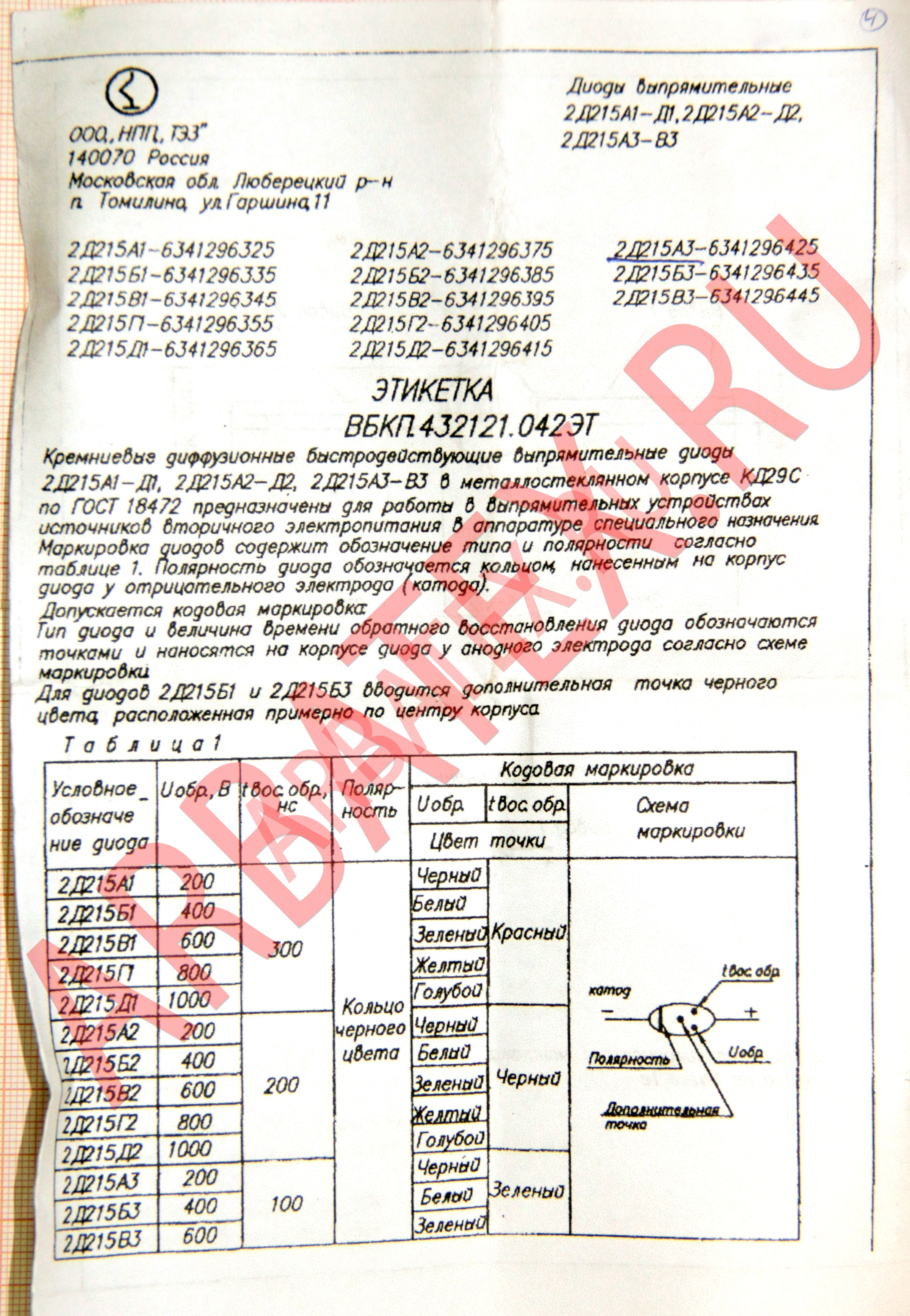 Для диодов 2Д215А2 вводится дополнительная точка чёрного цвета, расположенная примерно по центру корпуса.