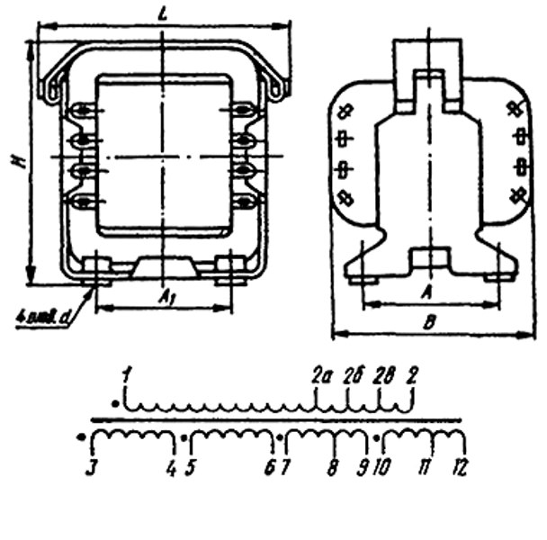 Накальные трансформаторы типа ТН в зависимости от габаритной мощности, типа магнитопровода, напряжения сети питания и климатического исполнения имеют различные габаритные и установочные размеры. Конструкция трансформаторов разработана для установки на металлическом шасси аппаратуры или на печатных платах с креплением их винтами.