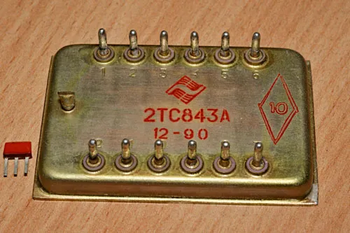 Транзисторная сборка 2ТС843А, состоящая из четырех переключающих кремниевых мезапланарных структур n-p-n транзисторов.